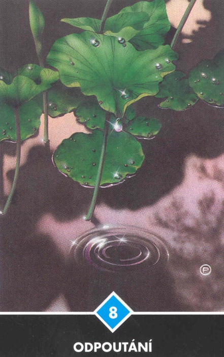 Na obrázku lotosových listů za časného jitra si můžeme podle kruhů na hladině všimnout, že jedna krůpěj právě ukápla dolů do vody. Je to vzácný okamžik, okamžik plný naléhavosti. Když se kapka poddá gravitaci a sklouzne z listu dolů, ztrácí svou předchozí identitu a splývá s nekonečnou vodní hladinou. Můžeme si představit, že dříve než spadla, musela se pěkně třást, na hranici mezi známým a nepoznatelným. Vytažení této karty znamená, že něco je u konce, něco je dokončováno. Ať už je to cokoli - práce, vztah, domov, který jsi miloval, cokoli, co ti pomáhalo definovat sebe sama - je na čase se od toho odpoutat, přijmout smutek s tím spojený, ale nepokoušet se nic zadržovat. Čeká na tebe něco většího, na objevení čekají nové dimenze. Překročil jsi dod, od kterého už není návratu, a gravitace dělá svoje. Pusť se - představuje to osvobození.