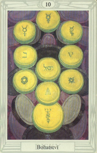 Kartu Desítku disků (bohatství) z Crowleyho Thovt tarotu vybrala vybrala SHEEN.